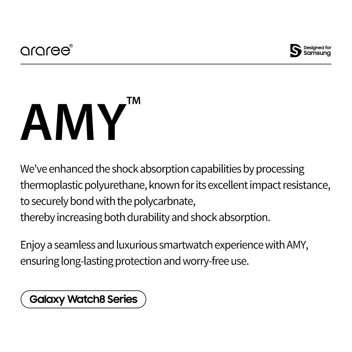 Proteksi Tangguh dengan Gaya Sporty & Modern! Araree Amy Case dirancang khusus untuk Anda yang aktif dan ingin memberikan perlindungan tingkat tinggi pada Samsung Galaxy Watch 8. Berbeda dengan seri Nukin yang bening, seri Amy hadir dengan kombinasi material hybrid yang lebih tebal di titik-titik krusial untuk meredam benturan ekstrem.