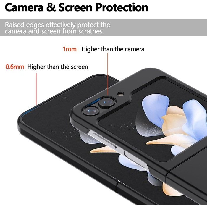 Case Z Flip 5 ini pada bagian kamera dan layar depan dibuat lebih tinggi, untuk melindungi dari goresan ketika diletakkan di media datar