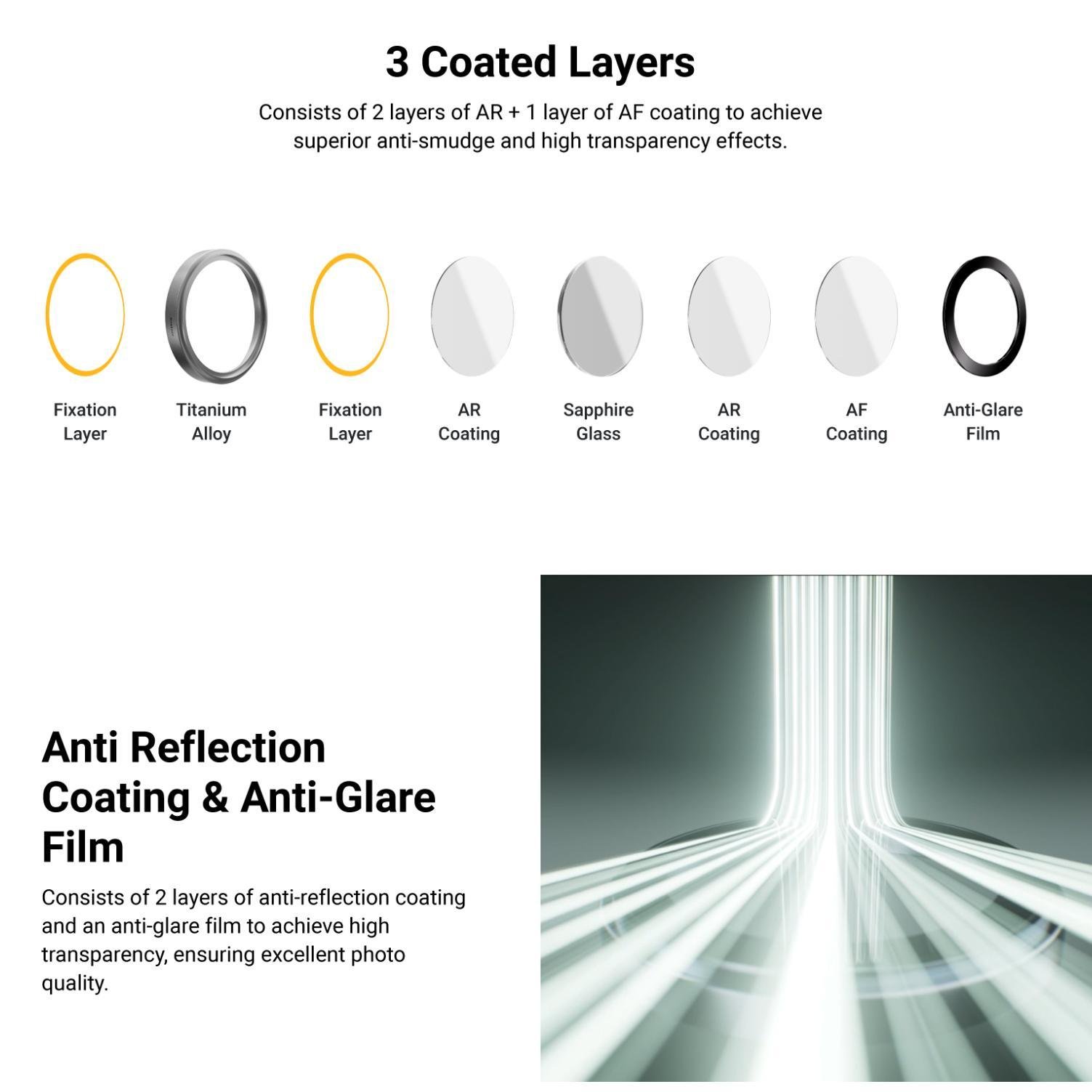 Menggunakan Lapisan Anti-Refleksi (AR Coating) 2 lapis dan Lapisan Anti-Noda (Anti-Smudge/AF Coating) 1 lapis. Kombinasi 3 lapisan ini memastikan transparansi tinggi hingga 92% dan mencegah pantulan cahaya (light scattering), sehingga kualitas foto dan video yang dihasilkan tetap jernih, tajam, dan tidak terdistorsi.