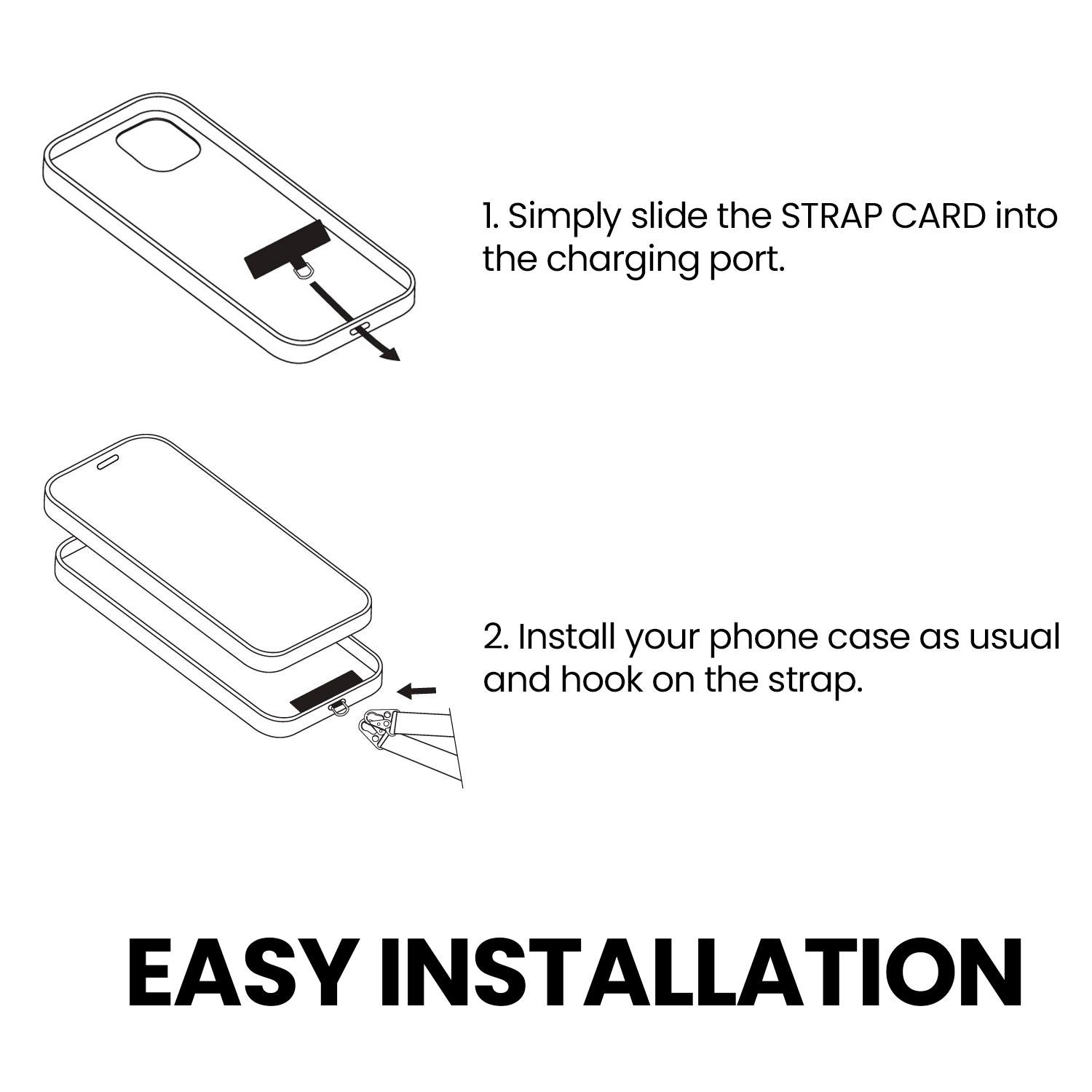 MagEasy Strap Card Hook ini mudah untuk dipasang, Letakkan strap card di bagian bawah hp (bagian charging port) pada bagian dalam casing